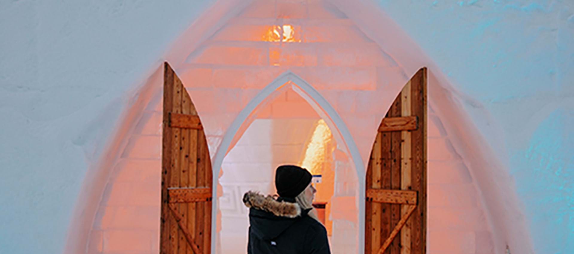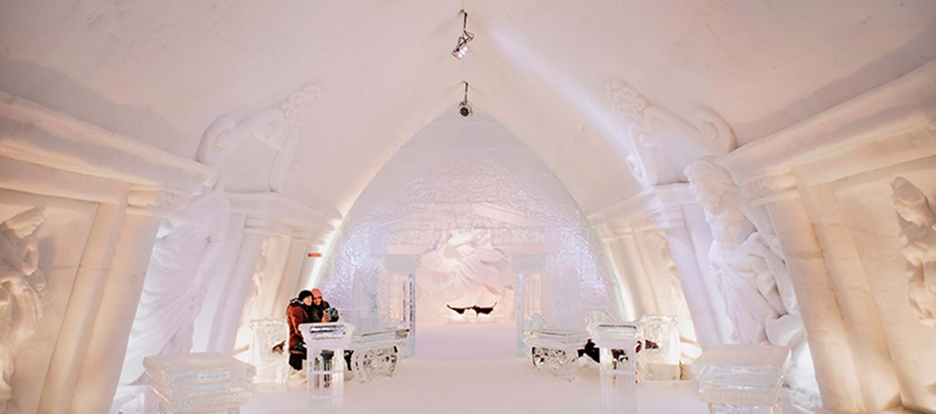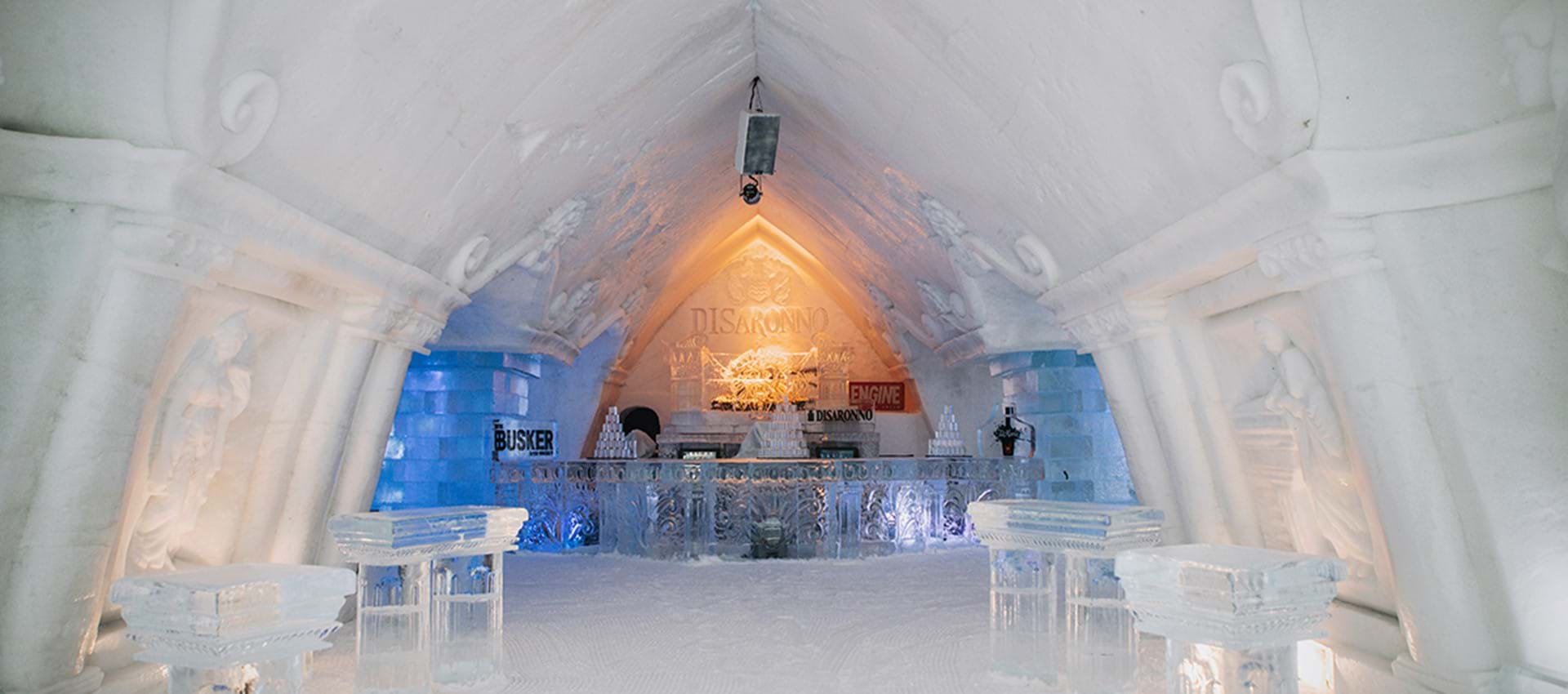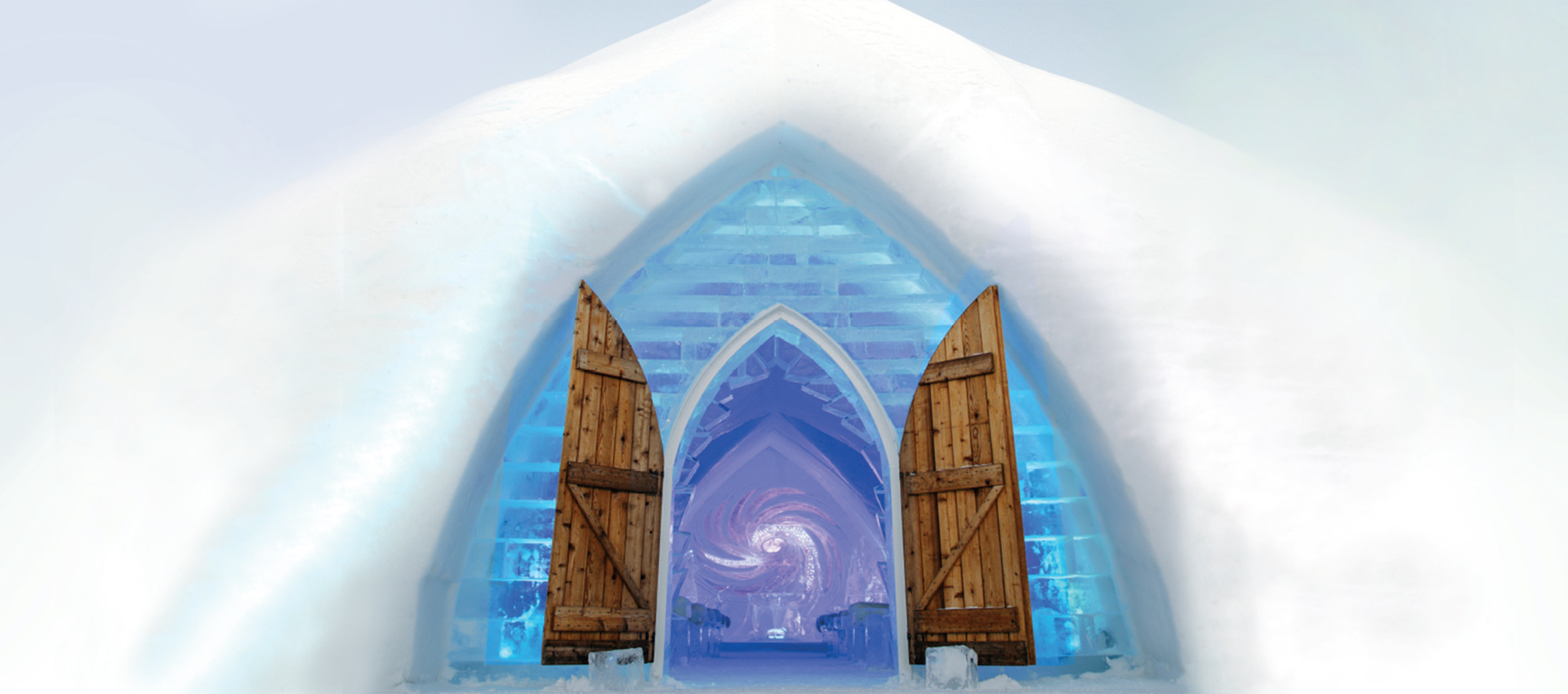 The only one of its kind in North America, the Hôtel de Glace (ice hotel) changes theme each winter to the delight of locals and tourists alike. Fascinating art and winter splendour greet you as soon as you enter the Grand Hall. You'll be awestruck by the hotel's rooms and themed suites which are decorated with majestic sculptures. Make sure to stop by our sumptuous chapel, where people from all over the world come to get married in magical ambiance. To add a touch of warmth to your visit, top it off with a delicious cocktail served in a glass made of ice!