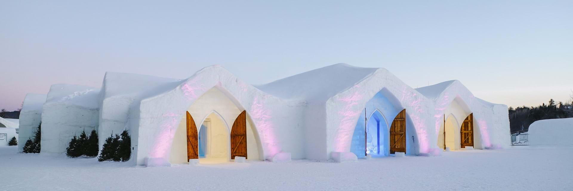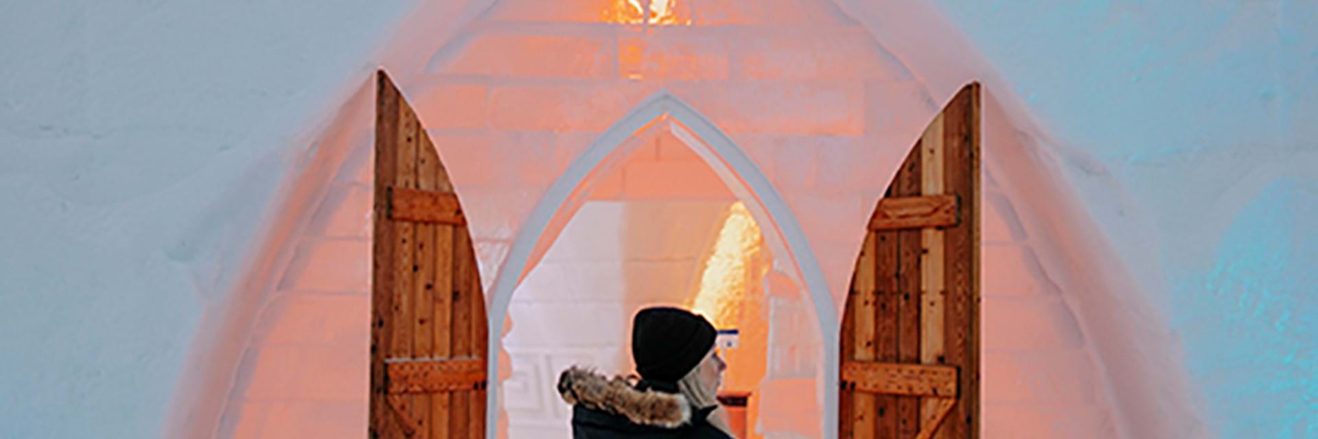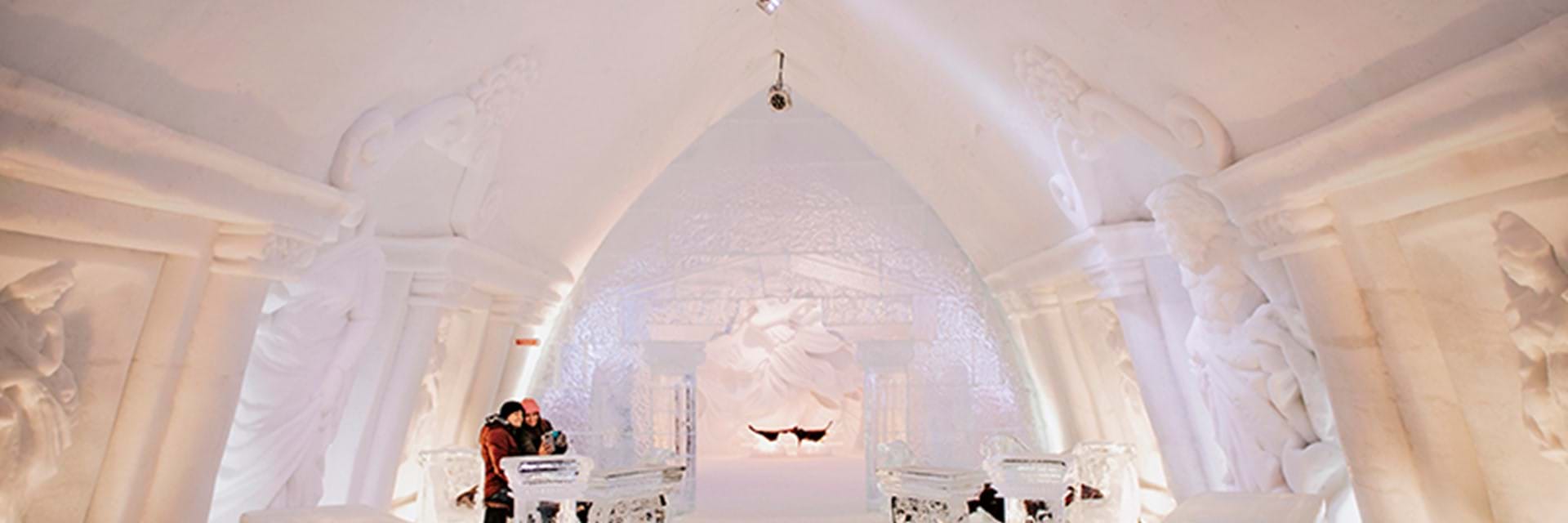 The only one of its kind in North America, the Hôtel de Glace (ice hotel) changes theme each winter to the delight of locals and tourists alike. Fascinating art and winter splendour greet you as soon as you enter the Grand Hall. You'll be awestruck by the hotel's rooms and themed suites which are decorated with majestic sculptures. Make sure to stop by our sumptuous chapel, where people from all over the world come to get married in magical ambiance. To add a touch of warmth to your visit, top it off with a delicious cocktail served in a glass made of ice!